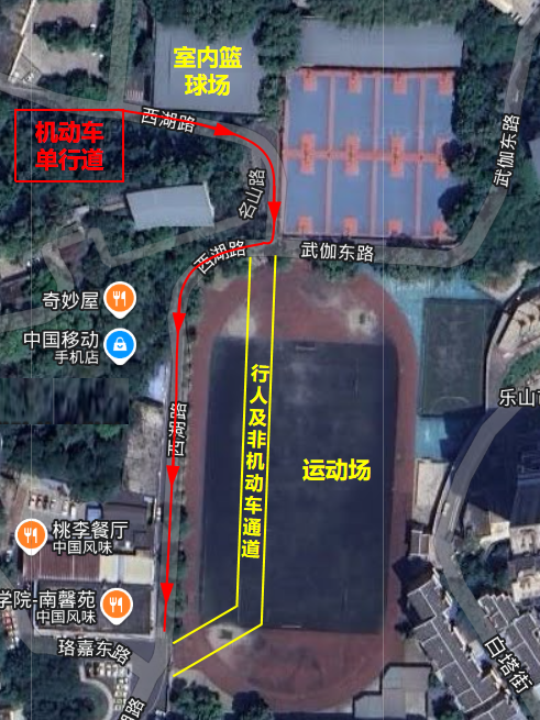 2026年1月1日至2026年2月28日,因南校区运动场维修改造及周边边坡支护,西湖路有部分道路(室内篮球场至移动营业厅段)拟被占用,施工期间机动车、行人及非机动车交通规划如下: