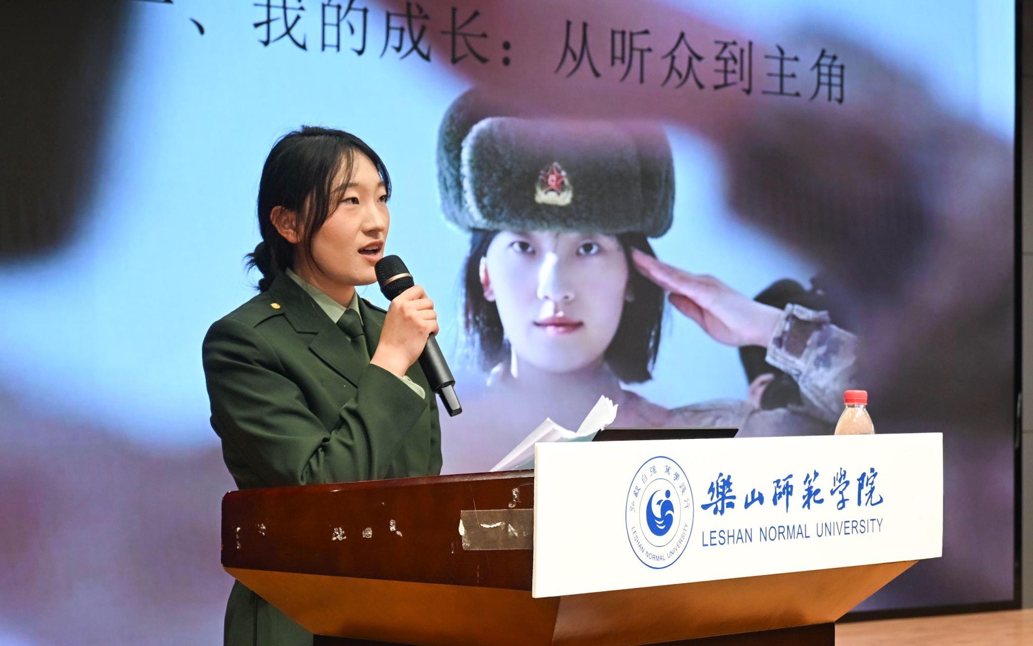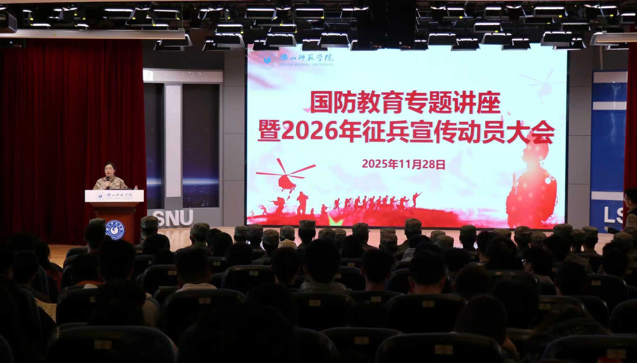 11月28日下午,我校在旷怡楼学术报告厅举办国防教育专题讲座暨2026年征兵宣讲动员大会。乐山市退役军人事务局副局长赵晋受邀作专题宣讲,各教学院征兵联络员,有入伍意向的学生,军事特长生及退役大学生代表共300余人参会。会议由武装保卫部副部长刘艳萍主持。