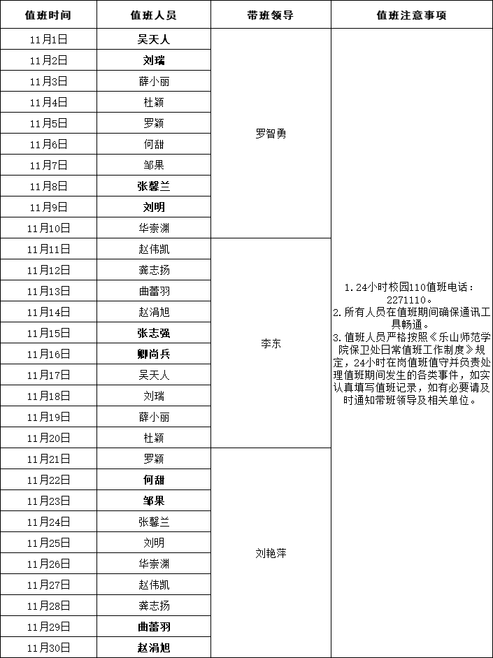 保卫处2025年11月份值班安排表